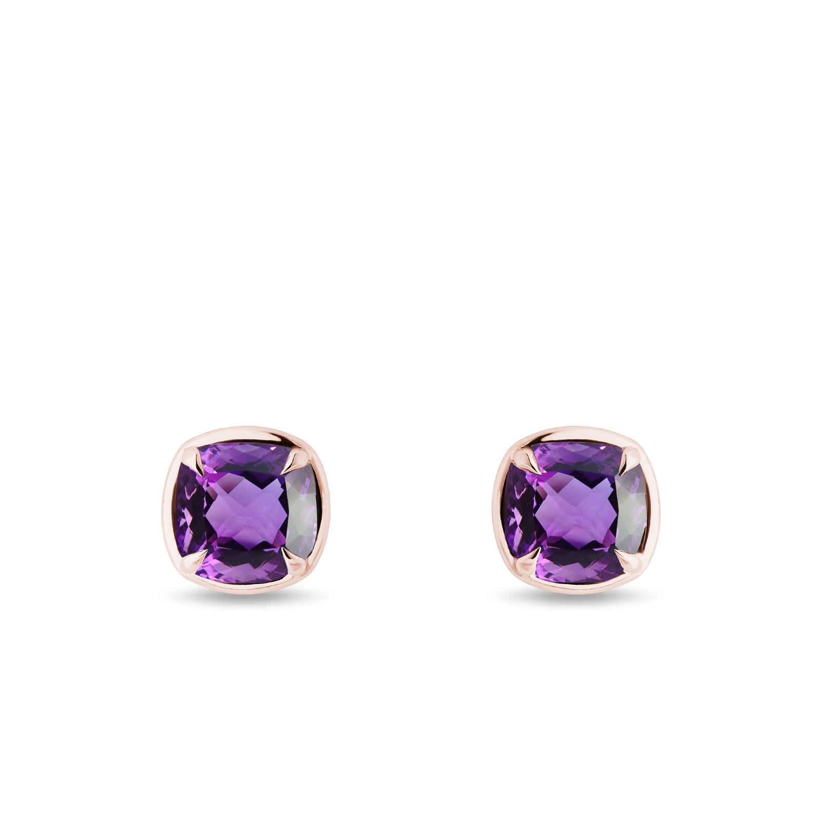 Romantyczne kolczyki sztyfty z 14-karatowego różowego złota. Fioletowe ametysty wyróżniają się na tle oprawy w kolorze miedzi. Dzięki poduszkowemu szlifowi i rozmiarowi 6 × 6 mm ich charakterystyczny, bogaty kolor został pięknie podkreślony. To oryginalny dodatek, który z pewnością przyciągnie uwagę.