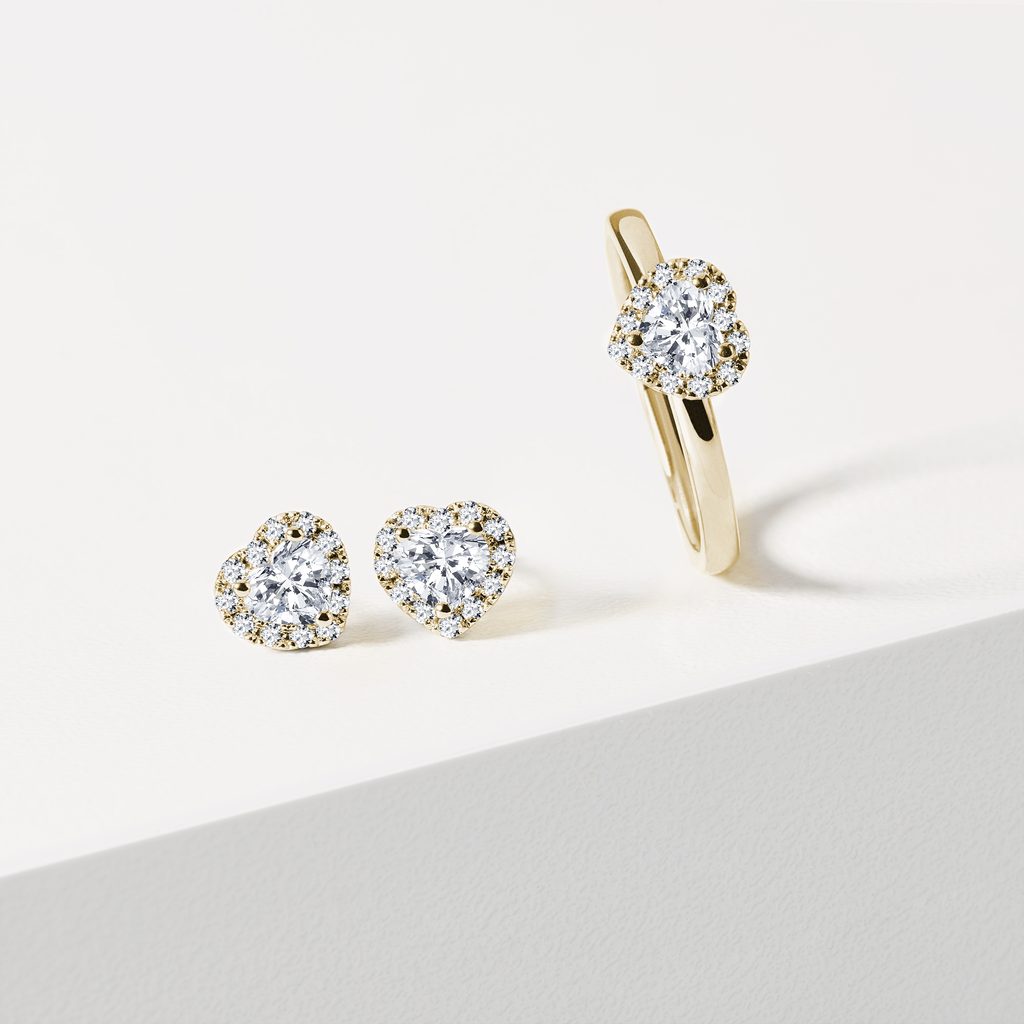 Kolczyki sztyfty w kształcie serca, wykonane z żółtego złota, ozdobione naturalnymi diamentami. Wokół sercowatego diamentu błyszczy prawa halo, w której osadzone są drobne, przezroczyste diamenty. Całość prezentuje się niezwykle luksusowo i pięknie połyskuje. To idealny wybór dla kobiet ceniących delikatną, ale wyrazistą biżuterię z romantycznym akcentem.