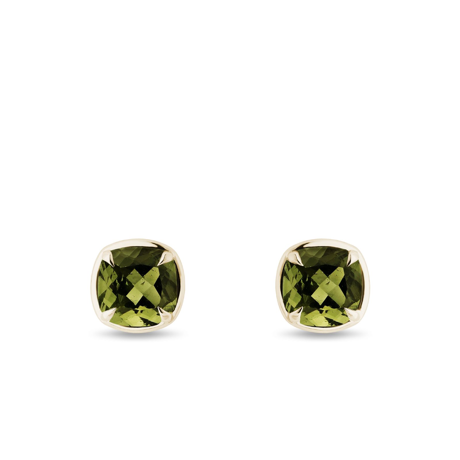 Wyraziste kolczyki wkrętki z 14ct żółtego złota, ozdobione wyjątkowymi, zielonymi wełtawinami o wymiarach 6 x 6mm w szlifie poduszkowym. Szczególnie ucieszą miłośniczki ciepłych tonów, jaki i typowo czeskich, naturalnych kamieni szlachetnych.