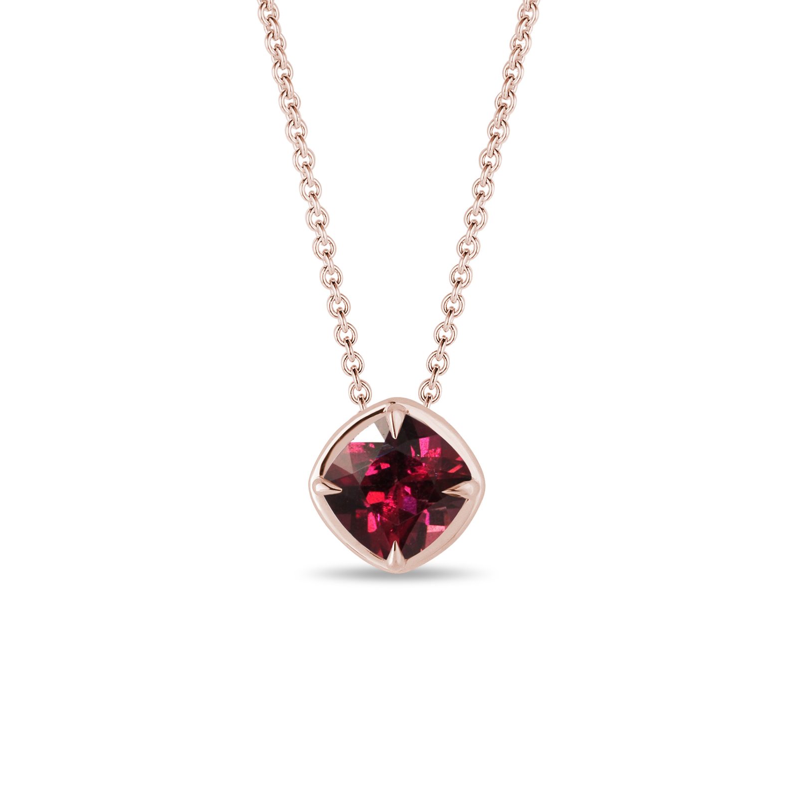 Elegancki naszyjnik z 14ct różowego złota, ujmujący czerwono-bordowym rodonitem, mniej znanym kamieniem szlachetnym z rodziny granatów. Barwę kamienia pięknie podkreśla szlif typu Cushion. Idealny prezent dla romantycznej duszy.