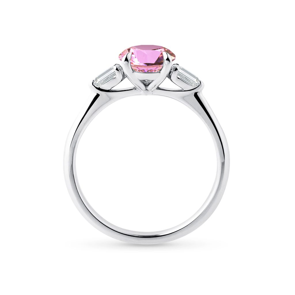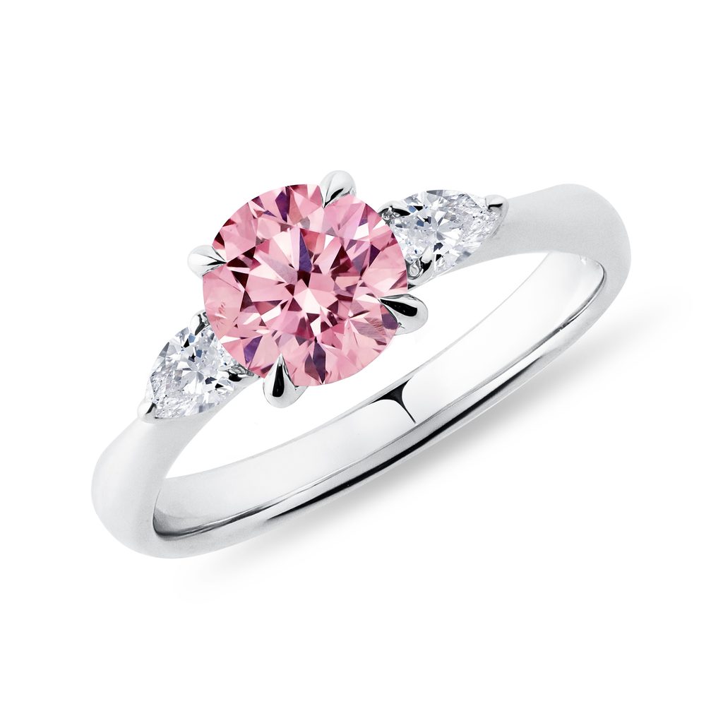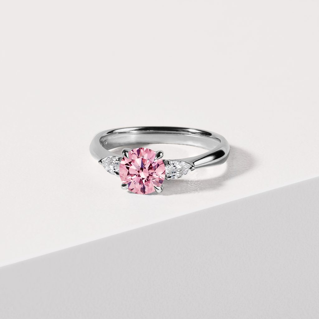 Pierścionek wykonany z 14 kt białego złota przyciąga wzrok dzięki efektownemu, różowemu diamentowi laboratoryjnemu o szlifie okrągłym i o masie 1,0 kt. Z każdej strony zdobią go diamenty o szlifie łezkowym, które dodatkowo podkreślają jego przejrzystość, kolor i blask. Projekt pierścionka inspirowany jest ponadczasową klasyką z nutą nowoczesności, dzięki czemu idealnie nadaje się na prezent na wiele okazji, w tym na oświadczyny.
