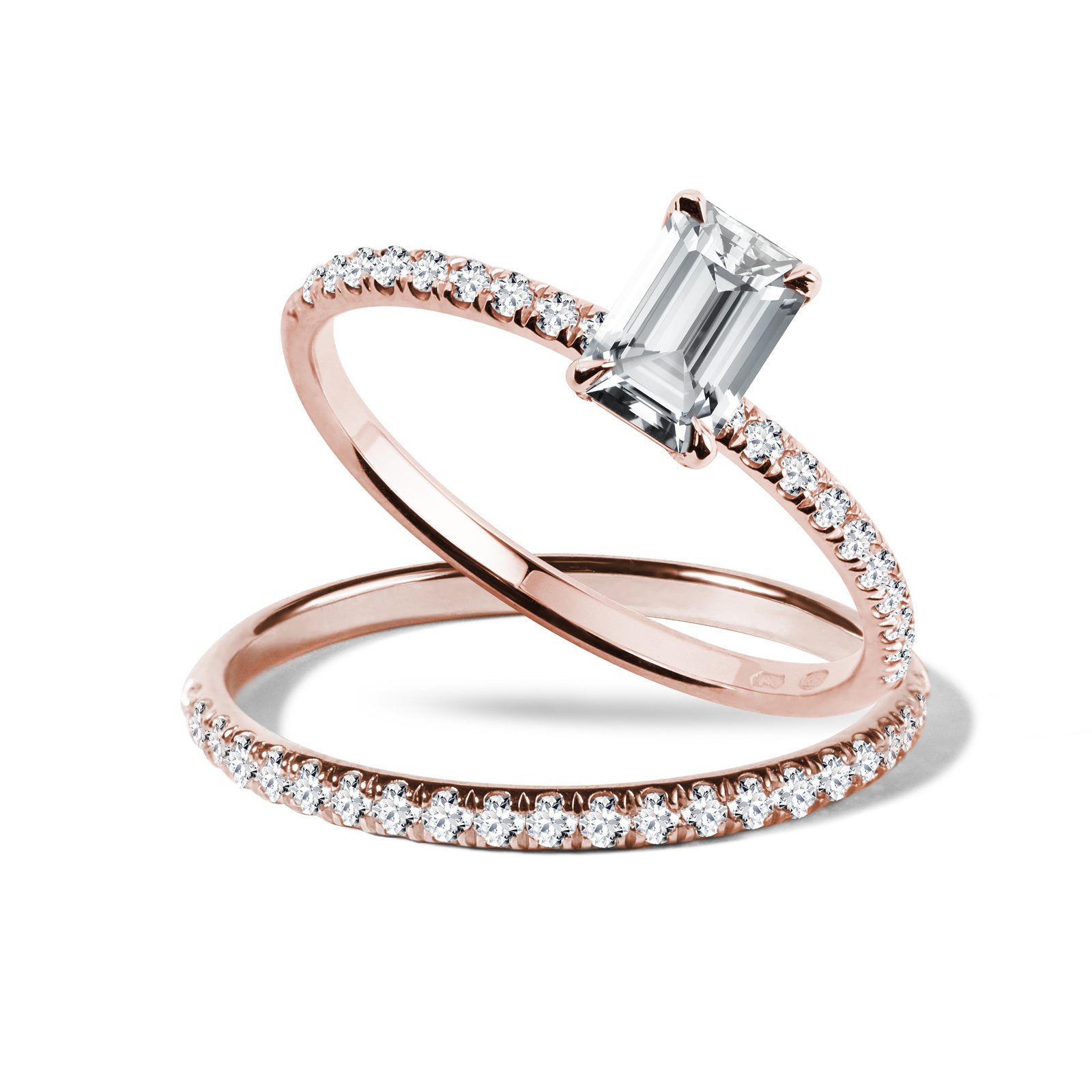 Luksusowy zestaw, który zawiera obrączkę i pierścionek zaręczynowy, wykonane z 14-karatowego, różowego złota. Pierścionek został ozdobiony dużym diamentem o szmaragdowym szlifie, a cienka obrączka jest wysadzana małymi diamencikami. Jest to wyjątkowe połączenie, które prezentuje się naprawdę luksusowo. Oferujemy także zestawy w innych odcieniach złota.